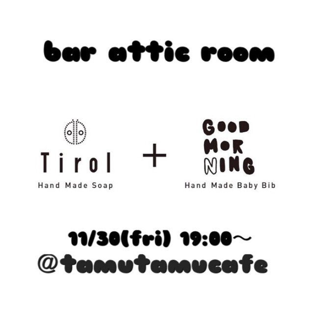 11月30日金曜日はタムタムカフェでも人気の物販を手がけている手作り石鹸のTirolチロちゃんとベビースタイのgood-morningのキムが2人のアトリエattic roomにちなんで、『bar attic room』をやってくれます☆Barとフードもやってくれるそうです!Secret?DJもいますよ。入場無料なので是非〜◎