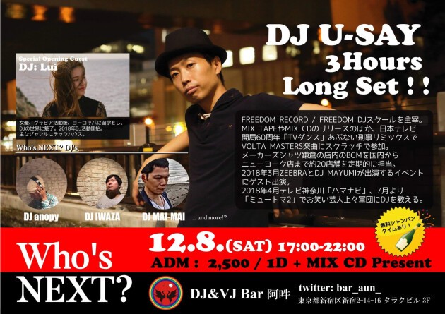 DJ U-SAYが3時間のロングセットでDJします♫クラブミュージックを映画のストーリーのごとく調理しますのでお楽しみに‼️ スペシャルゲストに、女優のDJ Luiちゃんをお招き