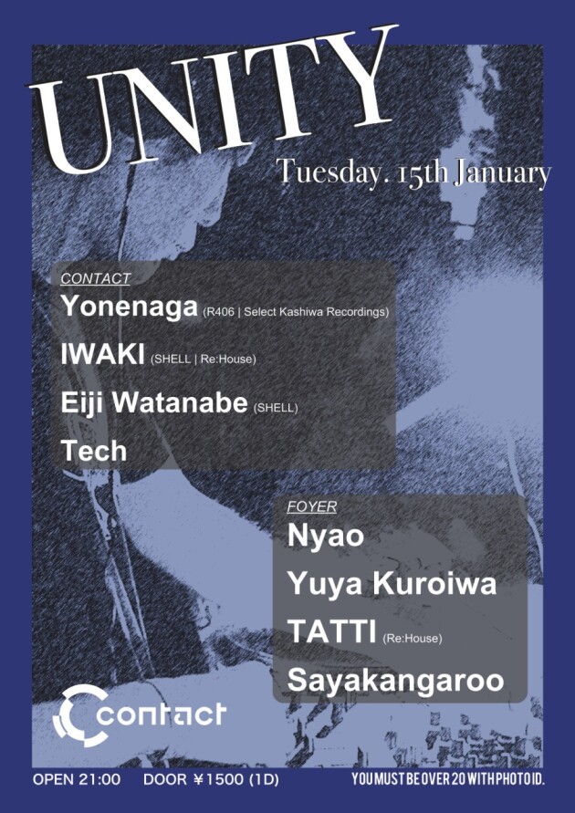 Contact gathers local DJs focused on Detroit techno. For this occasion, Select Kashiwa Recordings’ boss Yonenaga will take on the decks along with other local talents. Yonenaga has shared the decks with Derrick May and Juan Atkins for his own party ‘Select’, and his productions have been charted by Derrick May himself. Foyer floor will navigated by local underground DJs with the keyword ‘house’ in mind.