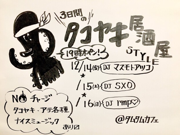 3日間限定!ダシたっぷりの特製タコヤキやアテ各種、日替わりのナイスDJによるGood Musicをご用意してタコヤキ居酒屋スタイルで営業しております!アツアツのタコヤキとビール…最高です◎