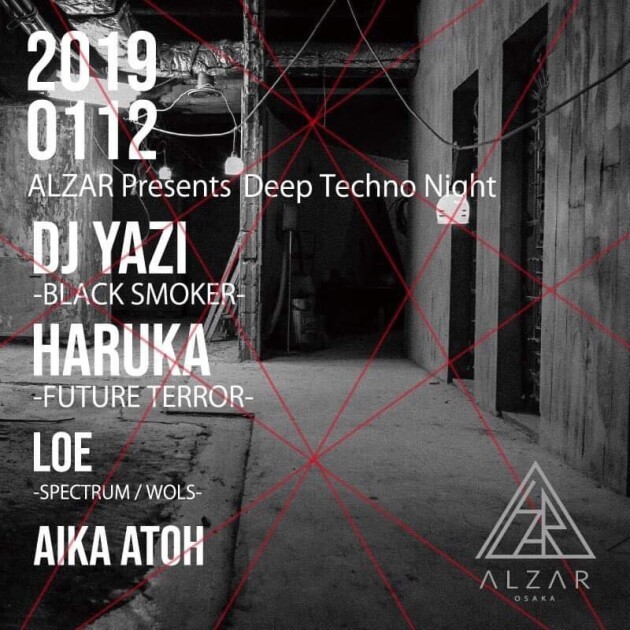 国内最アンダーグラウンドパーティ FUTURE TERRERをDJ NOBUと共に主宰し直球なテクノセットほか、その多様性と折衷主義で知られる「Haruka」、そして94年から活動をスタートし、高純度のディープ・トリップ・ミュージックを垂れ流し続ける脅威の黒煙集団・THINKTANKのオリジナルメンバー/DJであり、 BLACKSMOKERRECORDS主催"EL NINO"のレジデントDJでもある「DJ YAZI」の両氏をゲストに迎え、大阪からは関西老舗オーガナイズチーム"SPECTRUM"が手掛ける至極のディープテクノパーティーのレジデントであるLoeと若手のAika Atohが参加。
