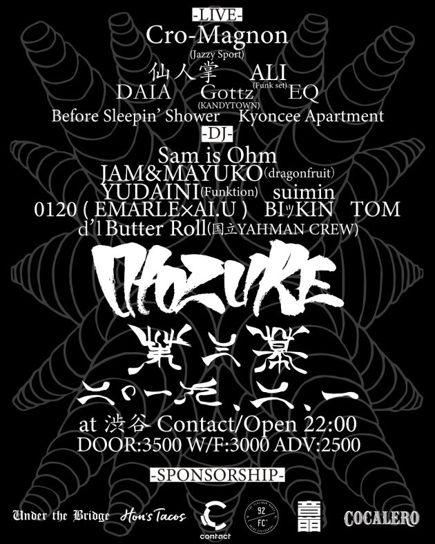 In the Contact floor, Sam is Ohm, a hiphop and R&B styled producer/DJ leads the pack. YUDAINI from Funktion, DJ suimin from Ikebukuro, DJ BIKKIN and di"ButterRoll from YAH MAN CREW brings the heat.