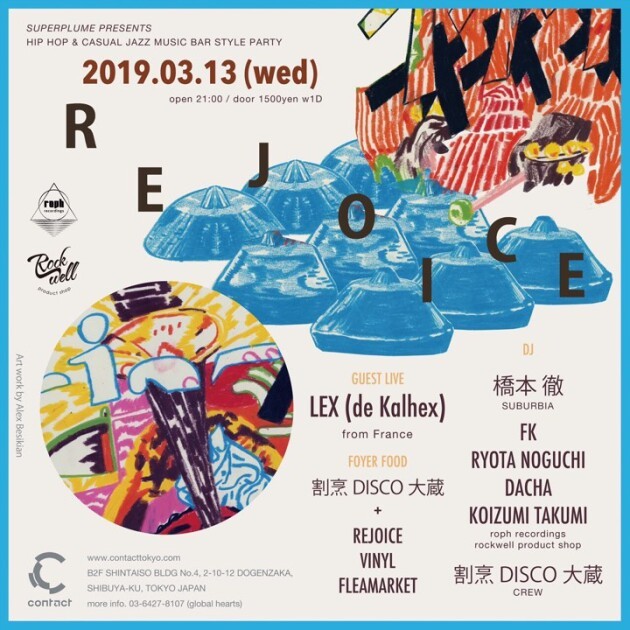 “Rejoice” will be joined by selectors Tohru Hashimoto, Roph Recordings’ label manager Koizumi Takumi (former manager of Nujabes), Hydeout Productions’ flagship shop “Tribe (+Guinness Records)” manager FK who has released from the same label. An evening for true music lovers brought to you by true selectors of Jazz and Hip Hop.