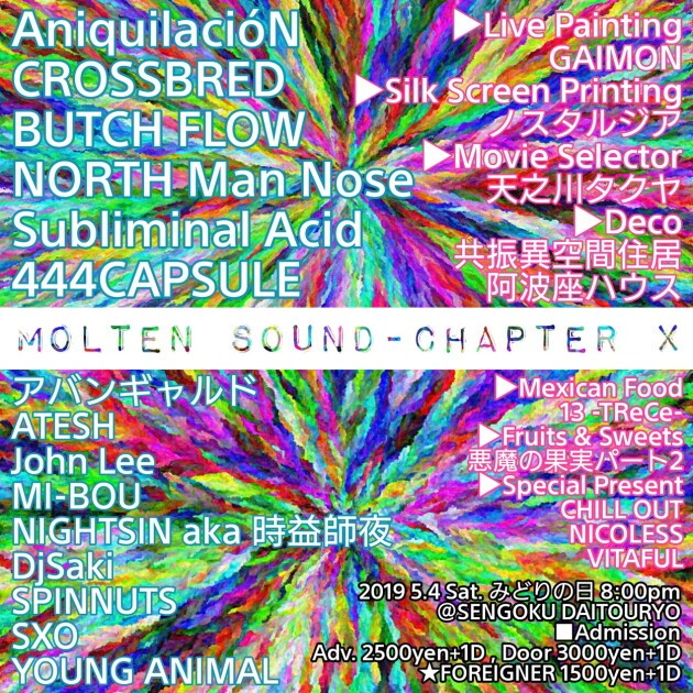 GW真っ只中のサタデーナイト!第10回目の開催を祝して各方面から強力アクトが緑橋ハシエンダに集結。誰もが未体験なハイブリッド・サイケデリック・ダンス・パーティー。混沌を極める大阪アンダーグラウンドの最深部…ジャンルやシーンの境界線を無効化するマッドチェスターな一夜。