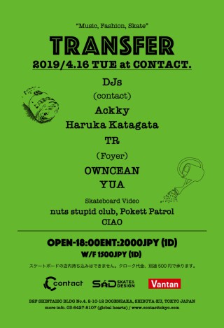 The skateboard culture x fashion x dance music. The young generation of skaters brings their new youth culture to Contact featuring some of Tokyo’s veteran DJs. In the Foyer floor, there will be a preview of『CIAO』, a skateboard video filmed in NY by Ricardo Napoli along with 2 crews of high schoolers, will be taking place.