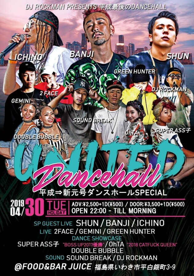 DJ ROCKMANが主催し、2011年から不定期開催のREGGAE DANCEHALL PARTY"UNITED DANCEHALL"が約3年ぶりに開催!!