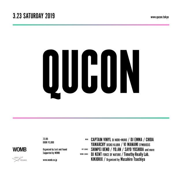 On top of that, Masahiro Tsuchiya (Rainbow Disco Club) will be organizing the WOMB LOUNGE featuring DJ KENT (FORCE OF NATURE), TIMOTHY REALLY, and KIKIORIX. What's more, the sale of Qucon goods is planned, and all the floors will be packed full of exciting content. We'll be awaiting your arrival.