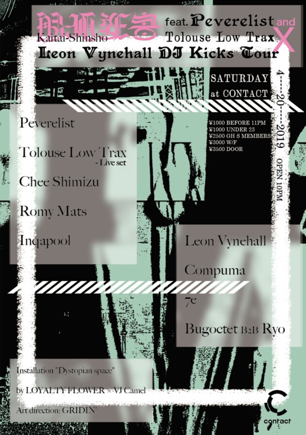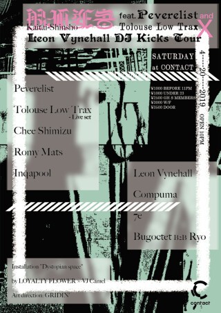 Romy Mats and VJ Camel curates the evening as“解体新書”Kaitaishinsho, featuring various electronic music from their perspective. Headlining Bristol’s Punch Drunk and Livity Sound’s Peverelist; a live set by Tolouse Low Trax, the resident of “Salon des Amateurs” in Düsseldorf, which explores sounds influenced by krautrock and post-rock; Leon Vynehall, whose mix cd series『DJ-Kicks』has had much success weaving through different spectrums and tempos of modern house music, will also be joining the lineup to navigate the crowd for the evening’s journey. From the local scene, Chee Shimizu, Compuma, and 7e bring forth their deep knowledge and skills to the decks. This will truly be a night showcasing the wide range of frequencies brought to you by distinct and talented acts.
