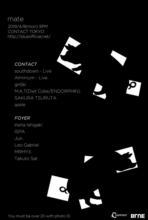 BLUEは、テクノやダブなどを中心とするライヴを繰り広げ自らの音楽を“業の深い音楽”と称するsouthdownを中心に、DJ/ギタリスト/フォトグラファー/ビデオプロデューサーなど、多岐にわたり活動するアーティスト達が所属する。mateではDJやライヴを主としたクラブイベントのほかに、カフェを利用した写真の展示イベントなども開催している。