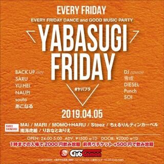 【YABASUGI FRIDAY】4/5(金)☆EVERY FRIDAY DANCE and GOOD MUSIC PARTY『YABASUGI FRIDAY #ヤバフラ』★★