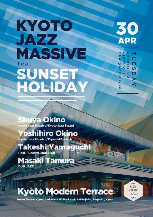一回目の人気ゲスト・ハウスLen、二回目のバーバー兼バーガー・ショップBurlesqueに続いての開催は、毎年Sunset Sundayが行なわれているKyoto Modern Terrace。火曜日ながら国民の祝日ということで、フィーチャリングSunset Holidayと題し、平成最後のKyoto Jazz Massiveを敢行します。ある意味これは密かに盛り上がる京都のテラス/ルーフ・トップシーズンの幕開けを告げる集い。