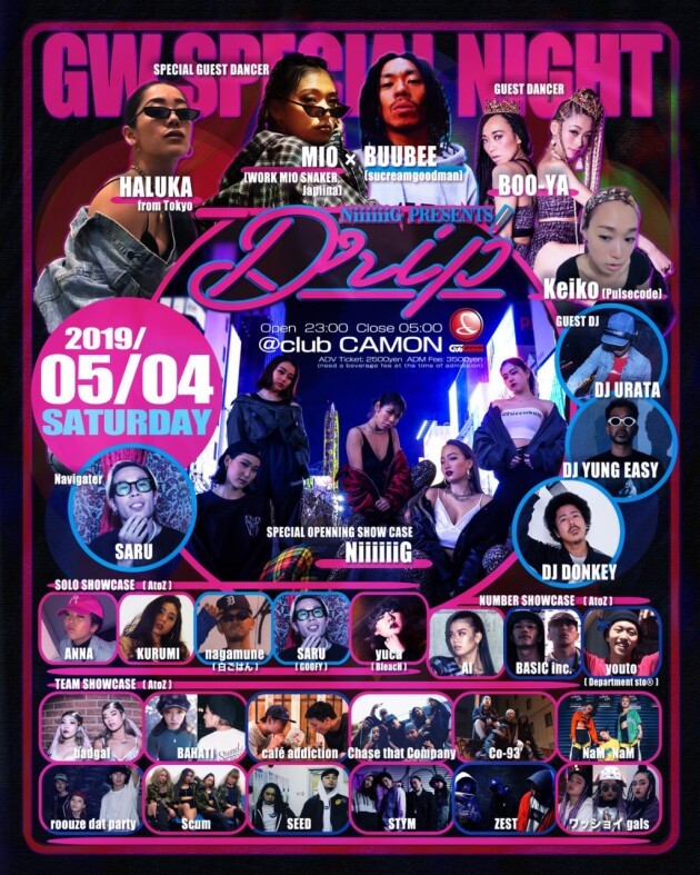 【Drip】5/4(土)☆NiiiiiiG presents『Drip』☆☆SP GUEST DANCERにMIO (WORK MIO SNAKER / Japiina) × BUUBEE (sucreamgoodman)、HALUKA from TOKYO、GUEST DANCERにBOO-YA、Keiko (Pulsecode)、GUEST DJにDJ URATA、DJ YUNG EASY、DJ DONKEYが登場★★