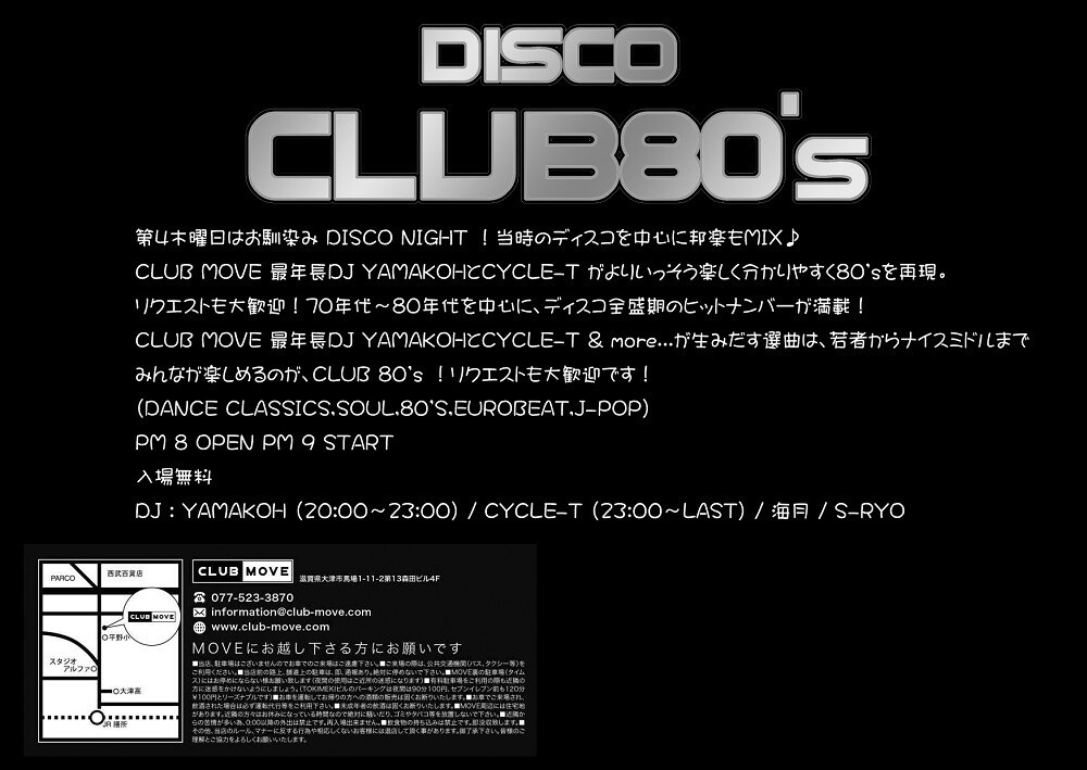 第4木曜日はお馴染み DISCO NIGHT !当時のディスコを中心に邦楽もMIX♪CLUB MOVE 最年長DJ YAMAKOHとCYCLE-T がよりいっそう楽しく分かりやすく80'sを再現。