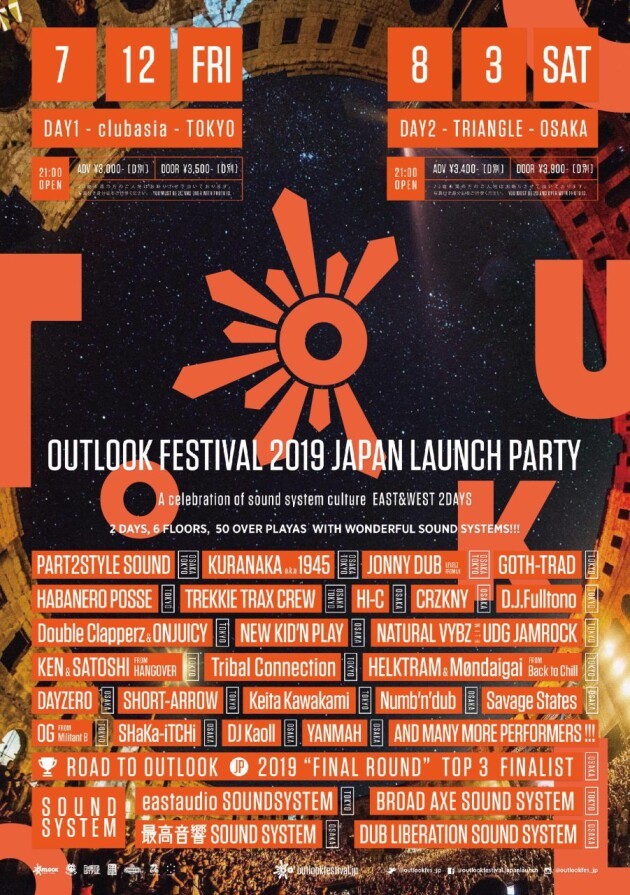 「OUTLOOK FESTIVAL JAPAN LAUNCH PARTY」には 日本を代表するベース・ミュージックのプレイヤーが集結し、アジア最高峰のサウンドシステムでプレイする、いわばアジア最強のベース・ミュージックの祭典。OUTLOOK FESTIVAL JAPAN 本祭の出場権をかけたコンテスト「ROAD TO OUTLOOK JAPAN」も見どころであり、各フロアに設置される日本屈指最強のサウンドシステム、レーベル毎のショウケース等、普段のクラブ・イベントでは見れない企画が満載だ。今年は東京・大阪の2Days!!!