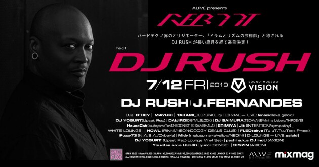 ハードテクノ界のオリジネーター、『ドラムとリズムの芸術師』と称されるDJ RUSHが長い歳月を経て再来日!