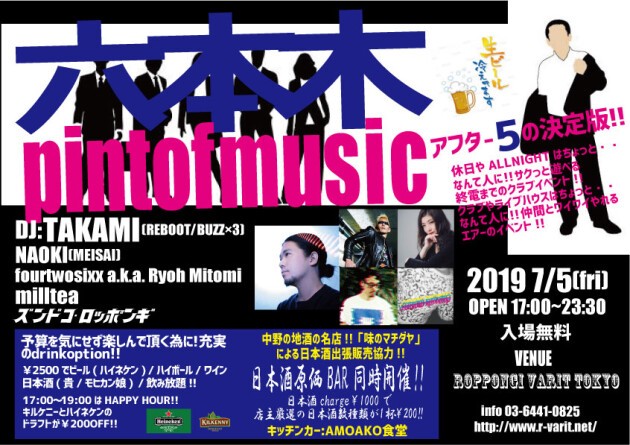 にて新たに立ち上げたあくまで終電まで盛り上がれるparty 「六本木pint of music」いわゆる音楽箱が減ってきている六本木にて、テクノ,ハウスの枠に収まらず、