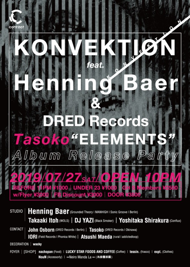 一方Contactフロアには、〈DRED Records〉からのアルバム「Elements」でサイケデリックな快楽性を多彩なビートフォームに乗せて表現した要注目株Tasokoが沖縄から登場。レーベルオーナーのJohn Osbornにくわえ、同郷のIORIとともに浮遊感のある陶酔サウンドで心地よい空間を演出する。John OsbornはHenning Baerの名EP「Gemini」のリリースを手がけているなど、今回のKONVEKTIONも音楽的な繋がりを感じさせるキュレーションセンスが光る。各出演者はもちろん、パーティ全体で生み出す躍動感もあわせて堪能すべし!