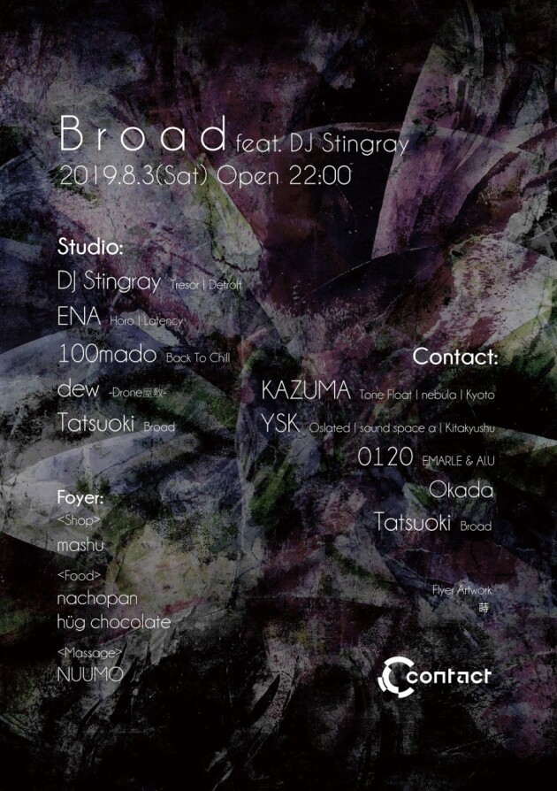Contactフロアはテクノ/ハウスをクロスオーバーさせた空間を展開。ヘッドライナーには、20年以上のキャリアを積んだ天才的な音響技術とオーディエンスを魅了させる空間演出にこだわり、拠点とする京都から全国、海外で活躍を広げている〈TONE FLOAT〉主宰のKAZUMA。福岡・北九州のsound space αを拠点としながら、ベルリンやアジア各国でもプレイし、MNMTやOslated等のディープテクノを代表するポッドキャストからもリリースを重ねるYSK。都内からはテレフォンクラブ主催の2人組、EMARLEとAI.Uによる0120もBroadに初登場。今まで以上に個性の強いラインナップで繰り広げる濃厚な一夜を体感して欲しい。