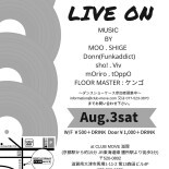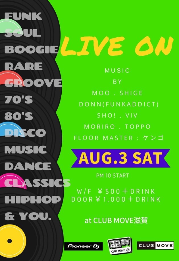 ~LIVE ON~はファンクを中心にソウルやダンスクラシックスなどの70年、80年代のブラックミュージックの土臭く泥臭い本質をさらに追求する内容に!MOVEでお馴染みの出演者 & レギュラー出演者の中でも特にブラックミュージックを愛するメンバー達が集結。メンバーが自信を持って「踊れる選曲」をPLAY!!ファンキー & レアなグルーブはフロアーに至福の時間をもたらします!