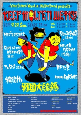 新しいダンス・パーティーの形を提示する『MOLTEN SOUND』第11弾は、大阪ハードコア・シーンを牽引するMASTERPEACE主催の大人気イベント『KEEP SCENE WEIRD』とお祭りコラボ!初のマチネ開催!夏の終わりを豪快に締めくくる爆音祭典@緑橋のハシエンダ戦国!