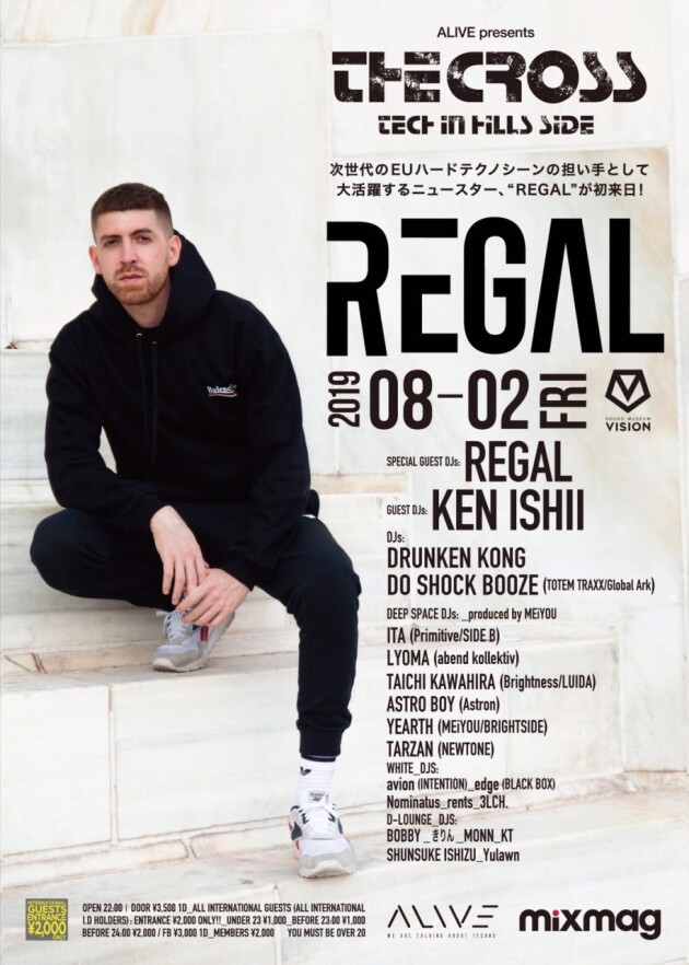 テクノ世界最大級の祭典である『AWAKENINGS』や『DGTL』を中心に、説明不要のドイツのテクノ発信地『Berghain』、スペイン・マドリードのメガクラブ『Fabrik』、そしてAMELIE LES主催の『EXHALE』への抜擢など、その活躍ぶりはまさに世界トップレベルと言えるだろう。イタリア出身、スペインからの刺客REGALが、夏本番、フロアを最大級に熱くする事間違いないであろう。国内サポート陣には前回のAnDの出演にて東京テクノのスタンダードレベルを見せつけ、オープンから常に終始フロアをキープし良質であり最先端のテクノを披露してくれた、テクノゴッドKEN ISHII、東京テクノのニュースター、DRUNKEN KONG、さらに東京レイブのキーマンとも言える、DO SHOCH BOOZEがお届けする。鉄板の一夜が構築されること違いない。どうぞご期待ください。