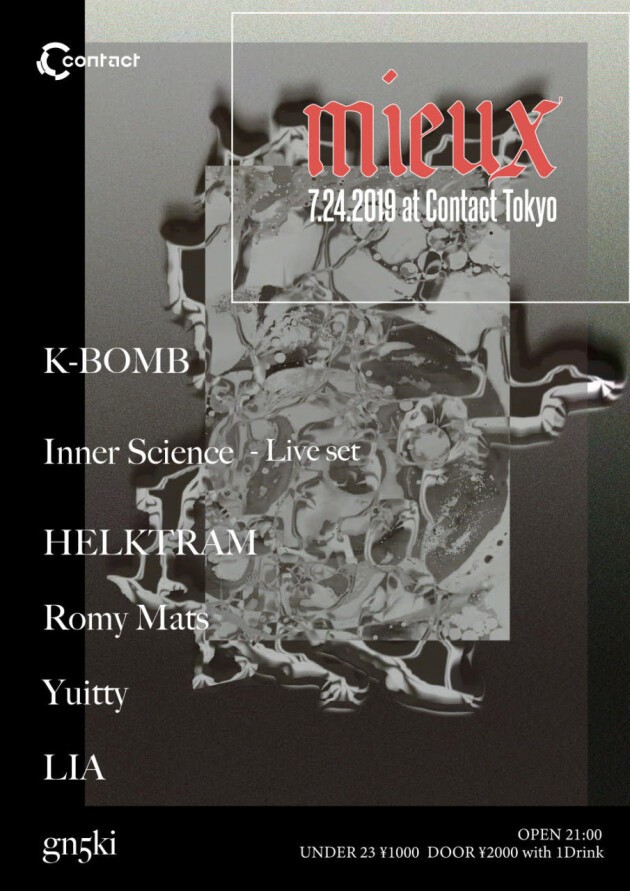 Tokyo’s underground figures from different paths unite for an evening. K-BOMB, the baddest and toughest from〈Black Smoker Records〉is joined by HELKTRAM, known for his appearances at the widely known bass party Back To Chill as well as international releases from labels like〈Encrypted Audio〉〈Subaltern Records〉. Inner Science, instrumental electronic musician, will be completing the lineup with a live set along with other local supporting DJs, each bringing their own distinct flavor to the dance floor.