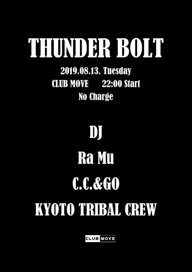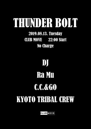 MUSIC IS THE ANSWER 8/13(火) THUNDER BOLT (HOUSE,TECHNO) PM 8 OPEN PM 10 START AM 3 CLOSE 入場無料 DJ : Ra Mu / C.C.&GO / KYOTO TRIBAL CREW