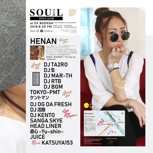 横浜福富町の老舗箱「cafe ex.Bodega」にて2008年より開催しているSOUL JAM。HIPHOP、REGGAE、R&BからBASSMUSIC、新譜を中心に旧譜まで流れ、ライブショーケース、ライブペイントなどコンテンツ盛り沢山のジャングルパーティー。毎回、各地よりゲストを招きソウルとソウルがジャムする福富町のピースでオリジナルな夜を提供いたします!