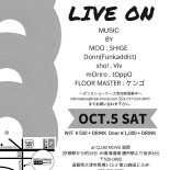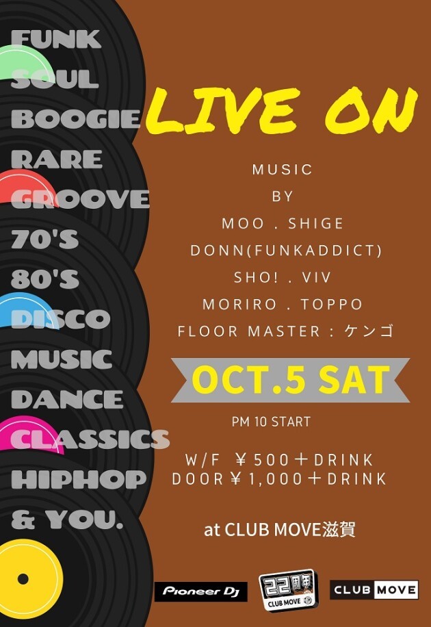 ~LIVE ON~はファンクを中心にソウルやダンスクラシックスなどの70年、80年代のブラックミュージックの土臭く泥臭い本質をさらに追求する内容に!MOVEでお馴染みの出演者 & レギュラー出演者の中でも特にブラックミュージックを愛するメンバー達が集結。メンバーが自信を持って「踊れる選曲」をPLAY!!ファンキー & レアなグルーブはフロアーに至福の時間をもたらします!