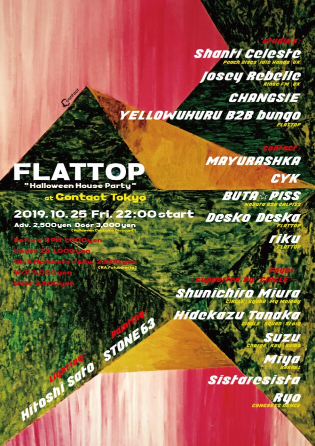 Supporting the headliners, heavily influenced by the sounds of UK, are CHANGSIE, FLATTOP’s organizer YELLOWUHURU, and bungo. In the Contact floor, Mayurashka, CYK crew, Nobuta and CALPISS’s unit BUTA☆PISS will be leading the pack of local DJs.