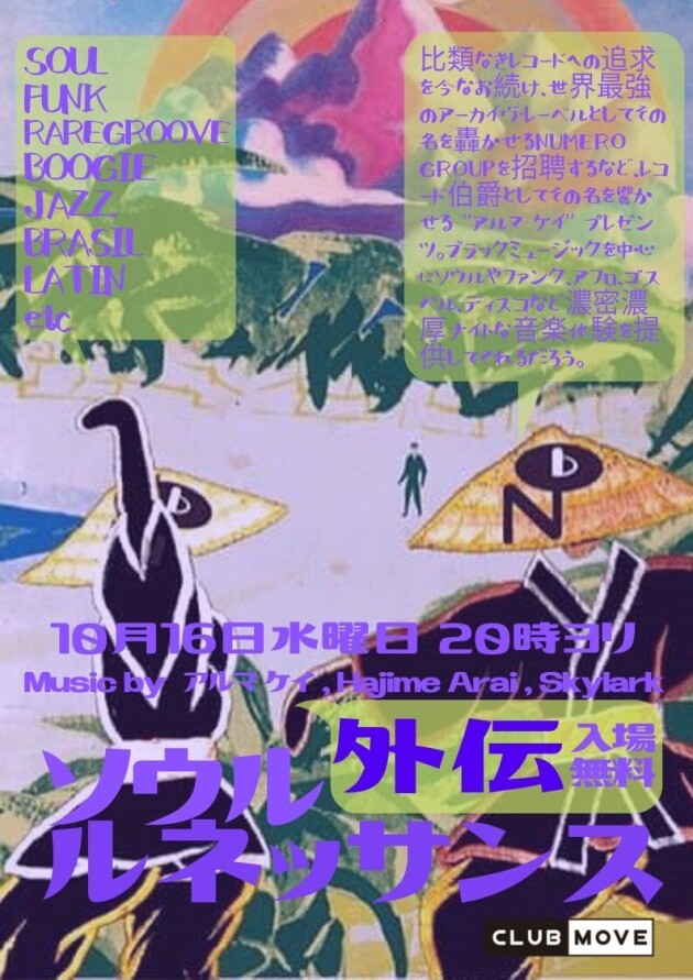 比類なきレコードへの追求を今なお続け、世界最強のアーカイヴ・レーベルとしてその名を轟かせるNUMERO GROUPを招聘するなど、レコード伯爵として一部の間でしられるレコード伯爵こと、 "アルマ ケイ" プレゼンツ。ブラックミュージックを中心にソウルやファンク、アフロ、ゴスペル、ディスコなど濃密濃厚ナイトな音楽体験を提供してくれるだろう。