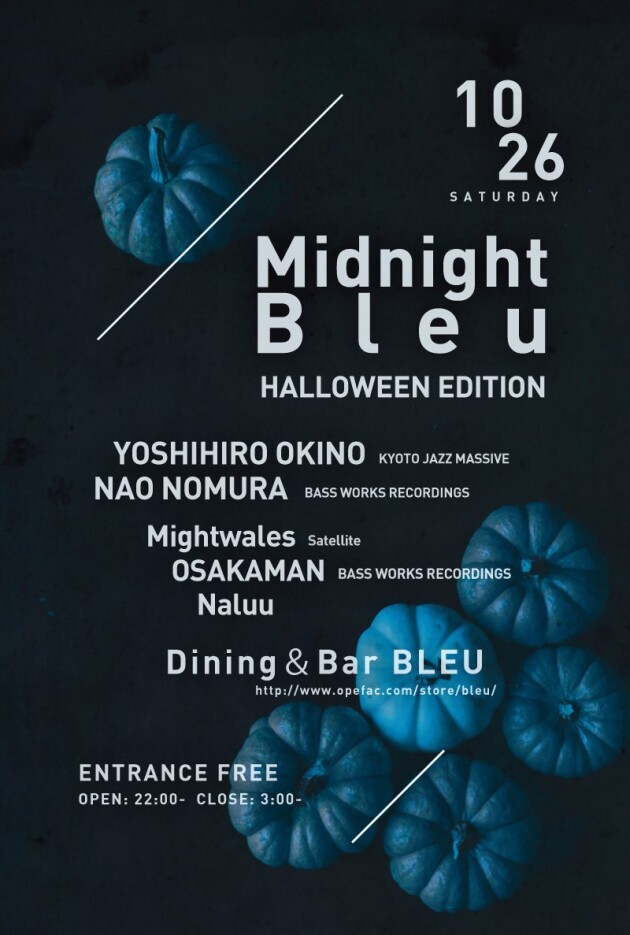 エポックメイキングなリバーサイドレストランとして大阪のナイトシーンを牽引し続けてきた"Dining&Bar BLEUにて開催される“MIDNIGHT BLEU”。今回はハロウィン・エディションとして開催。レジデントのKYOTO JAZZ MASSIVEのYOSHIHIRO OKINOとBWRのNAO NOMURAに加え、関西を拠点に活躍するクロスオーヴァーとテックハウスDJを招きインターナショナルな夜を彩り続ける。今回はSatelliteよりMightwales、BWRのOSAKAMAN 、Naluuを招き開催します。