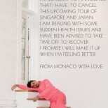 残念ながら、きたるシンガポールと日本のツアーのキャンセルをお知らせしなくてはなりません。