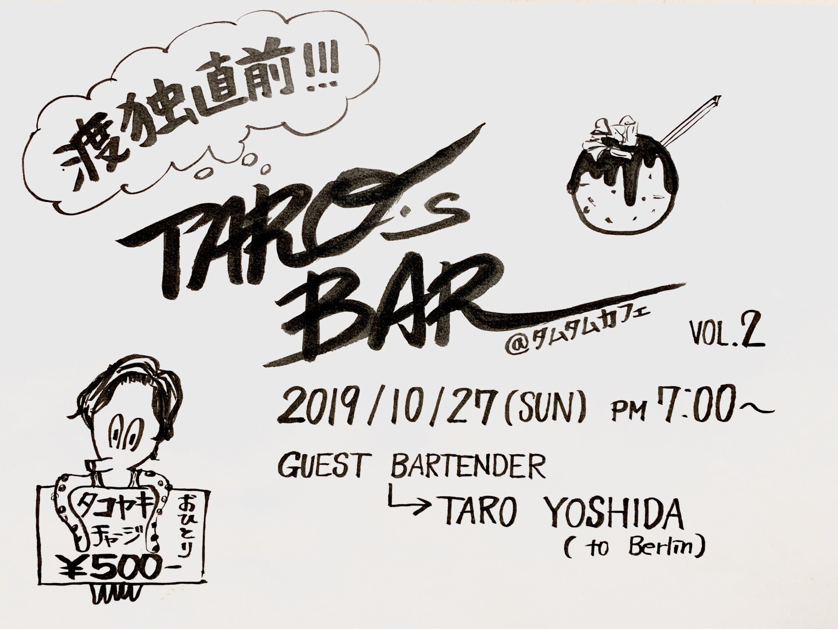 渡独直前!スペシャルゲストバーテンダー、吉田タロウ氏を迎えての『TARO's BAR』まさかの第2回開催☆入場無料です。チャージ500円でたこ焼き食べ放題◎無くなり次第終了です☆餞別がてら飲みに来て下さい!
