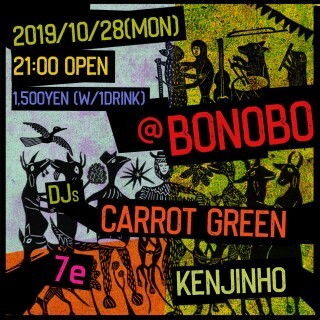 2019/10/28(mon) 21:00OPEN @bonobo 1,500YEN (w/1drink) DJs: Carrot Green (Rio de Janeiro) 7e Kenijinho ●FB event page● https://www.facebook
