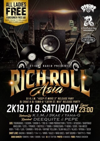 247HIPHOPラジオステーション2TightRadioがお届けするNEW PARTY "RICH ROLL ASIA" !! HIPHOP一等地 渋谷を長年牽引してきた超老舗ビッグクラブclub asiaにて開催!! 全3フロアを完全解放し腕利きのDJ, Rapper, GOGO DANCERが渋谷の土曜日をロックする!! またこの日はDJ K.I.M. "KEEP IT MOVE 3" そしてDJ 3Kae & DJ YAMA-G "Latin St. Mix"のダブルリリースパーティーも兼ねており祭り体制万全!! そしてオールタイム女性完全無料!!!!! そしてそしてクラブ酒の新定番COCALEROがサポート!! これぞ鉄壁のエンタメパーティー!! ただ遊ぶのではない。徹底的に遊び散らかしにいらしてくださいッ!!!!!!!!!!!!