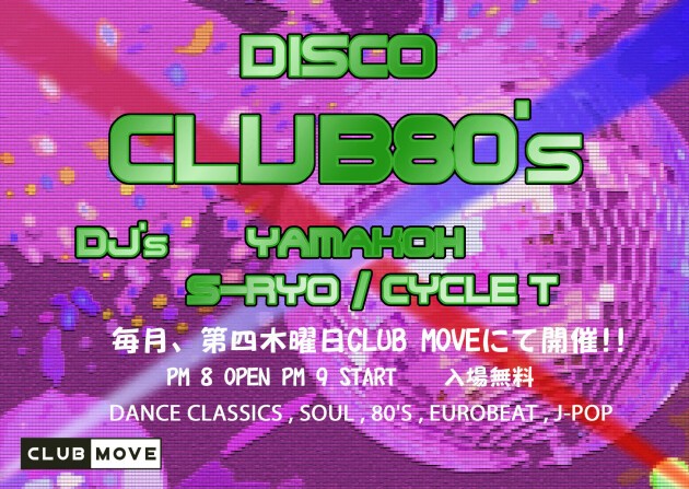 第4木曜日はお馴染み DISCO NIGHT !当時のディスコを中心に邦楽もMIX♪CLUB MOVE 最年長DJ YAMAKOHとCYCLE-T がよりいっそう楽しく分かりやすく80'sを再現。
