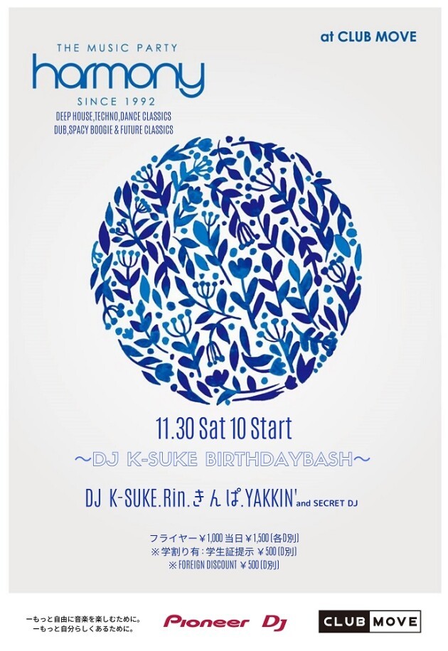 11月はMOVEのオーナーでもあり"HARMONY"の創始者であるDJ K-SUKEのBIRTHDAY BASH!!