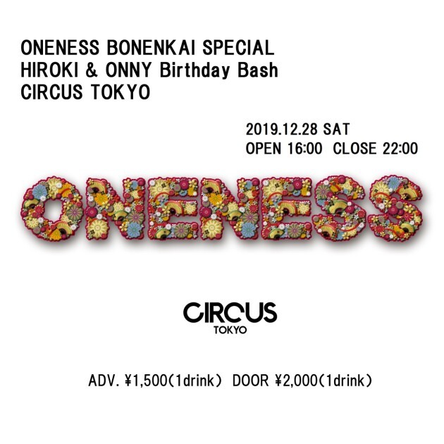 12月はONENESSにとってSpecialな月です。オーガナイザーのHIROKI、ONNYのBirthdayがあります。ONENESS 忘年会SPECIALはそんな2人のBirthday Bashも兼ねて開催させていただきます。