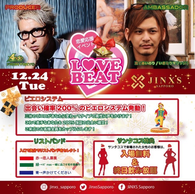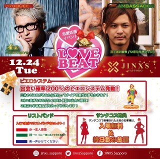 あいのりメンバーが東京で始めた伝説の恋愛応援イベント『LOVE BEAT』がまたもやJINXS SAPPOROで開催決定! 男女共に飲み放題あり、出会える率200%のモンスターパーティLOVE BEATで素敵な異性を見つけて楽しい思い出を残そう!
