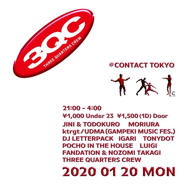 Three Quarters Crew hosts their party 3QC, where they provide the remaining 25% to the 75% satisfaction of your daily lives in the various cultures of Tokyo. The grooves that make it real are derived from the mutual feedbacks from the people. The vibrant colors of house music creates a mellow space that forms a bond for people that intertwines various backgrounds.
