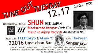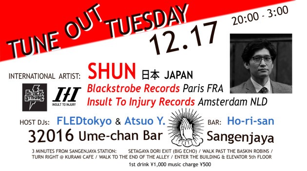 Tune ouT Tuesday is a monthly event with DJs from the Tokyo underground who support international DJs at the venue 32016 in Sangenjaya, Setagaya, Tokyo.