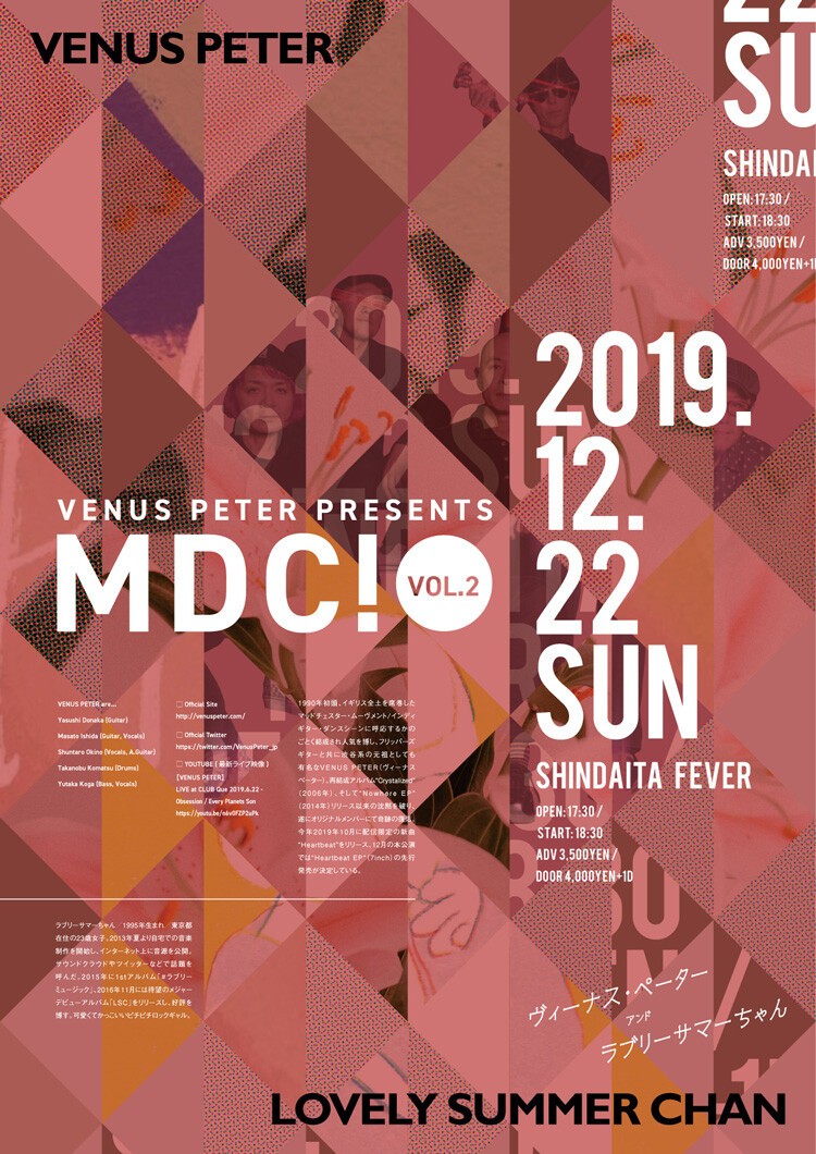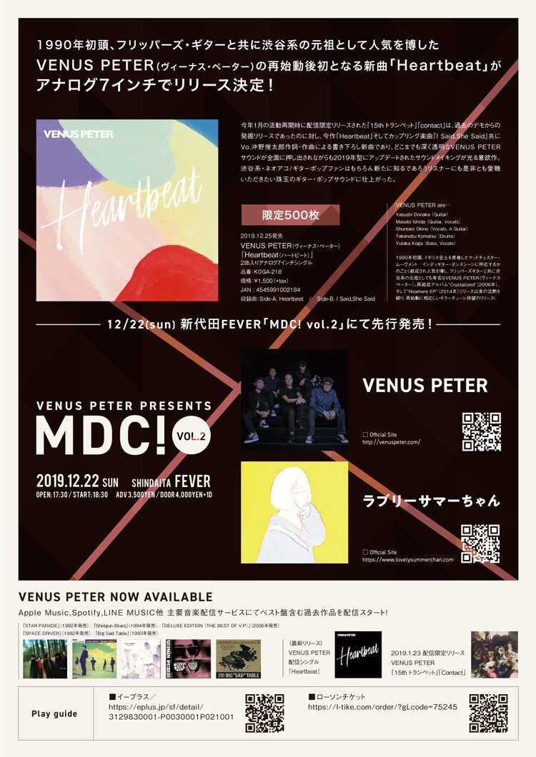 1990年代初頭、フリッパーズ・ギターと共に渋谷系の元祖として人気を博したVENUS PETER(ヴィーナス・ペーター)の再始動後初となる新曲「Heartbeat」がアナログ 7インチでリリース決定!「MDC! vol.2」にて先行発売!