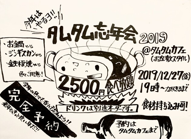 2年振りに開催!今年もみなさまありがとう◎お鍋やらジンギスカンやら鉄板料理などで年忘れ☆定員に達し次第予約は締め切ります。予約は12月26日木曜迄◎