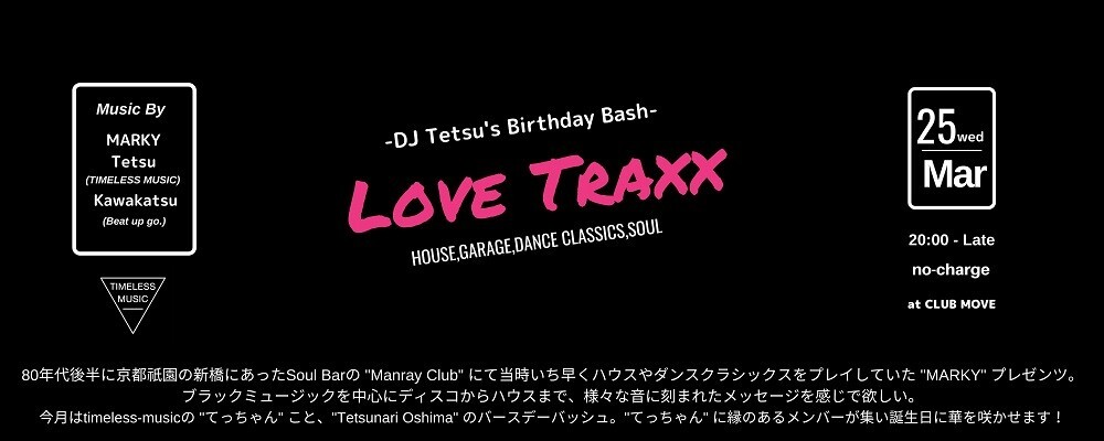 今月はtimeless-musicの "てっちゃん" こと、"Tetsunari Oshima" のバースデーバッシュ。"てっちゃん" に縁のあるメンバーが集い誕生日に華を咲かせます!