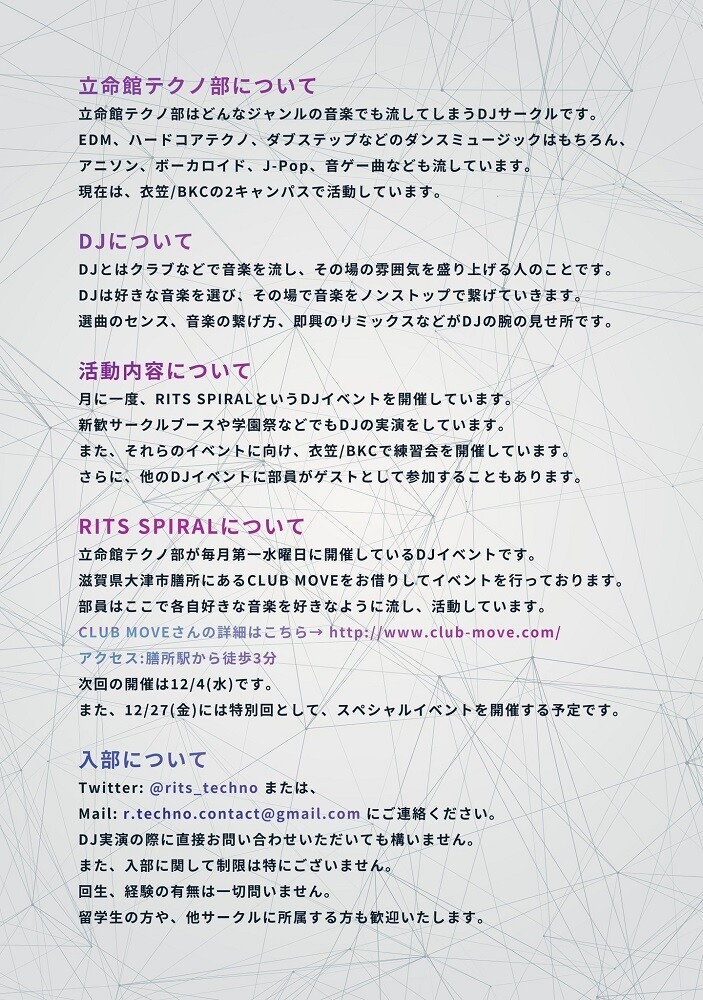 立命館テクノ部による10年以上続く老舗イベント "SPIRAL" は普段通りのテクノハウスに始まり、普段のMOVEでは聞けないアニソンやハードコアまでジャンルの垣根を超えて多くの音楽を聞いていただけるイベントです!