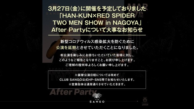 ※振替公演日程については改めてCLUB SANGO公式HP・SNS等でお知らせいたします。
