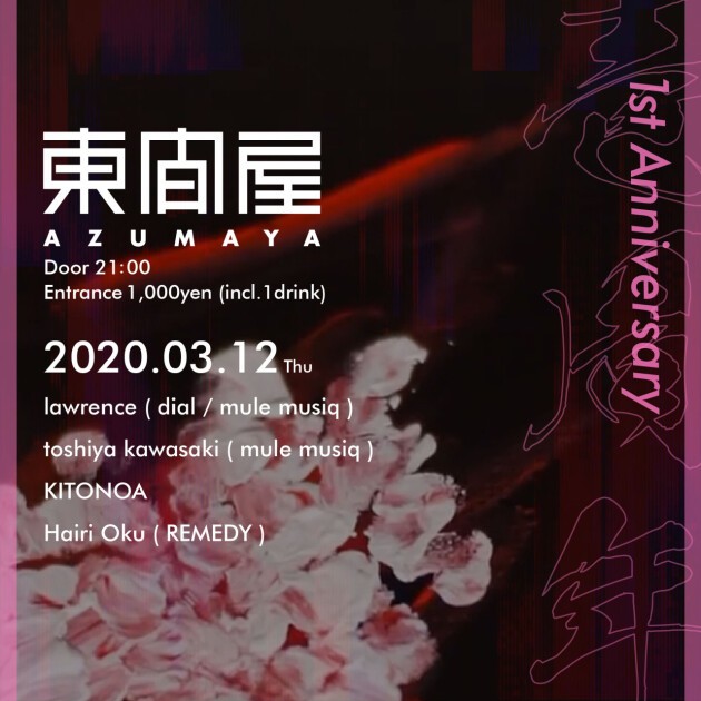 そのlawrenceも多数リリースするレーベル[mule musiq]主宰のtoshiya kawasaki、バックボーンであるヒップホップをハウス/テクノへと昇華したオリジナルなプレイを聴かせるKITONOA、渋谷KOARAを拠点とするパーティ“REMEDY”のメンバーHairi Oku。