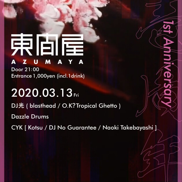 3/13 (Fri)は、東高円寺GRASSROOTSのハコ番を経て、沖縄移住後も全国のフェスティバル、クラブを飛び回るDJ光、クラシックから最新までをプレイし、東京のハウスミュージックシーンに欠かせないユニットDAZZLE DRUMS、最早東京のクラブシーンの中核を担う存在となったDJコレクティブCYK。