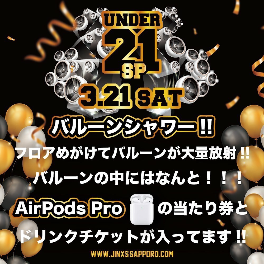21歳以下の方は男女問わず完全入場無料! 六本木や渋谷を中心に全国的に活動するDJ CHIN-NENがJINXSの土曜日をプロデュース! フロアにめがけてバルーンが大量放射!バルーンの中にはAir Pods Proの当たり券が?!